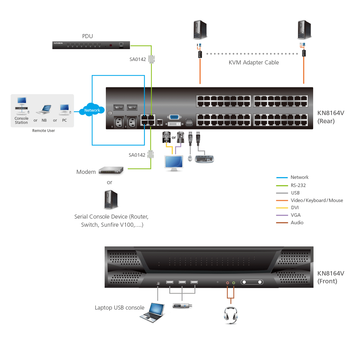 The KN series offers out-of-band (OOB) management that enables IT administrators to manage network devices (e.g. server, storage, router/switch) in server rooms via management networks that are separate from the main/production networks. So if there’s difficulty in accessing the network devices through the production network, the administrators can still access them via the KVM switch. The KVM switch offers several out-of-band access methods, such as a direct console connection from a local computer, a USB console connection from a laptop, a PSTN connection via modem, or a dedicated management network connection via the Ethernet (LAN) port.