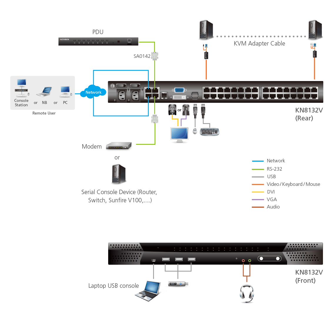 The KN series offers out-of-band (OOB) management that enables IT administrators to manage network devices (e.g. server, storage, router/switch) in server rooms via management networks that are separate from the main/production networks. So if there’s difficulty in accessing the network devices through the production network, the administrators can still access them via the KVM switch. The KVM switch offers several out-of-band access methods, such as a direct console connection from a local computer, a USB console connection from a laptop, a PSTN connection via modem, or a dedicated management network connection via the Ethernet (LAN) port.