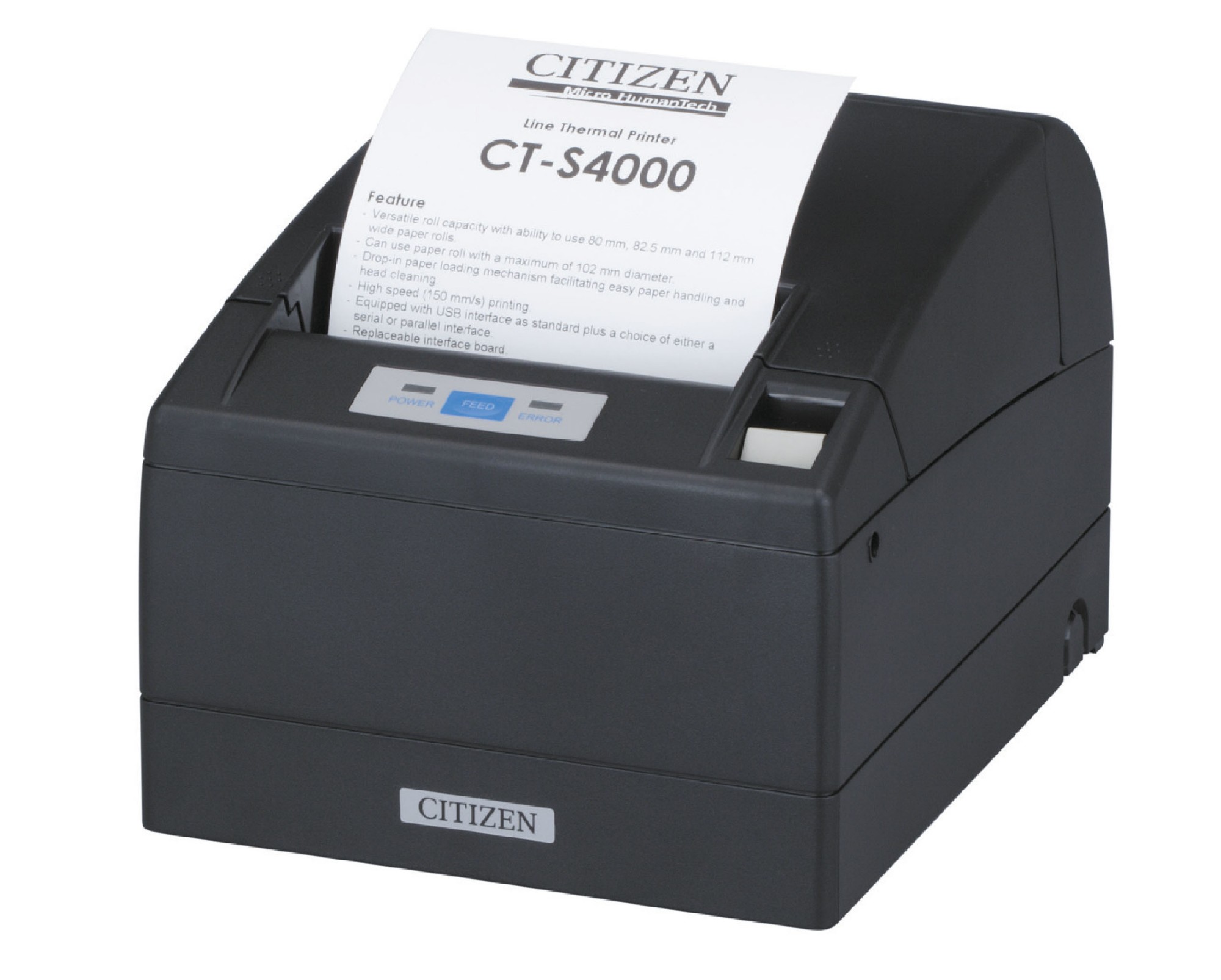The compact CT-S4000 thermal printer produces high quality 3 and 4 inch width labels, at speeds of 100mm/sec. This robust machine is easy to use, with simple and reliable media loading mechanisms. It’s also extremely versatile with desktop or wall mount options, plus the ability to store logos in Flash memory and print bar codes as well as receipts. With its unique DMA (Direct Memory Access) text and graphics can download faster to increase productivity.