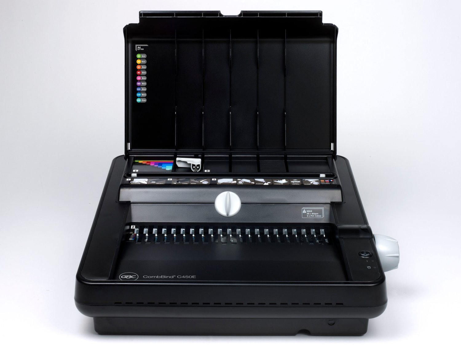 Binding doesn't get any simpler! The CombBind C450E is ideal for the average-sized office with everyday binding requirements. Electronic paper punching makes the binding process even easier and the binder is also equipped with features such as auto centering and a paper separator. You can also choose colour-coded ProCombs for maximum productivity. The C450E combines a punch capacity of up to 25 x 80gsm sheets with a binding capability of up to 450 sheets using 51 mm spines. Binds A3 portrait, A4 or A5 sizes.