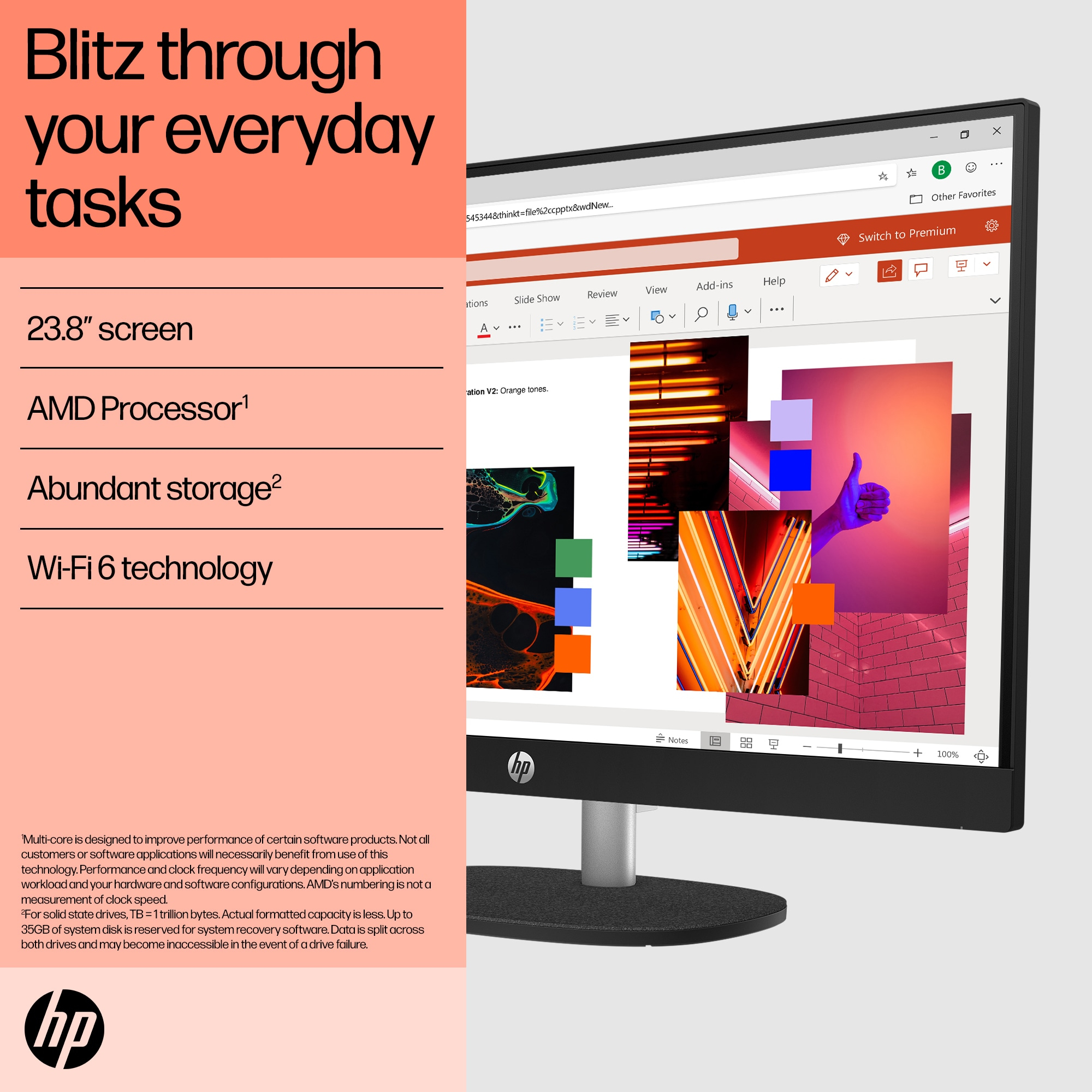 This slim, HP 23.8" All-in-One Desktop PC empowers you to do more while using less. Responsibly manufactured using post-consumer recycled and ocean-bound plastics[1] and is EPEAT Gold Registered and ENERGY STAR Certified[2]. With a powerful processor, upgraded memory and enhanced multitasking features, there’s no compromise for heightened performance.