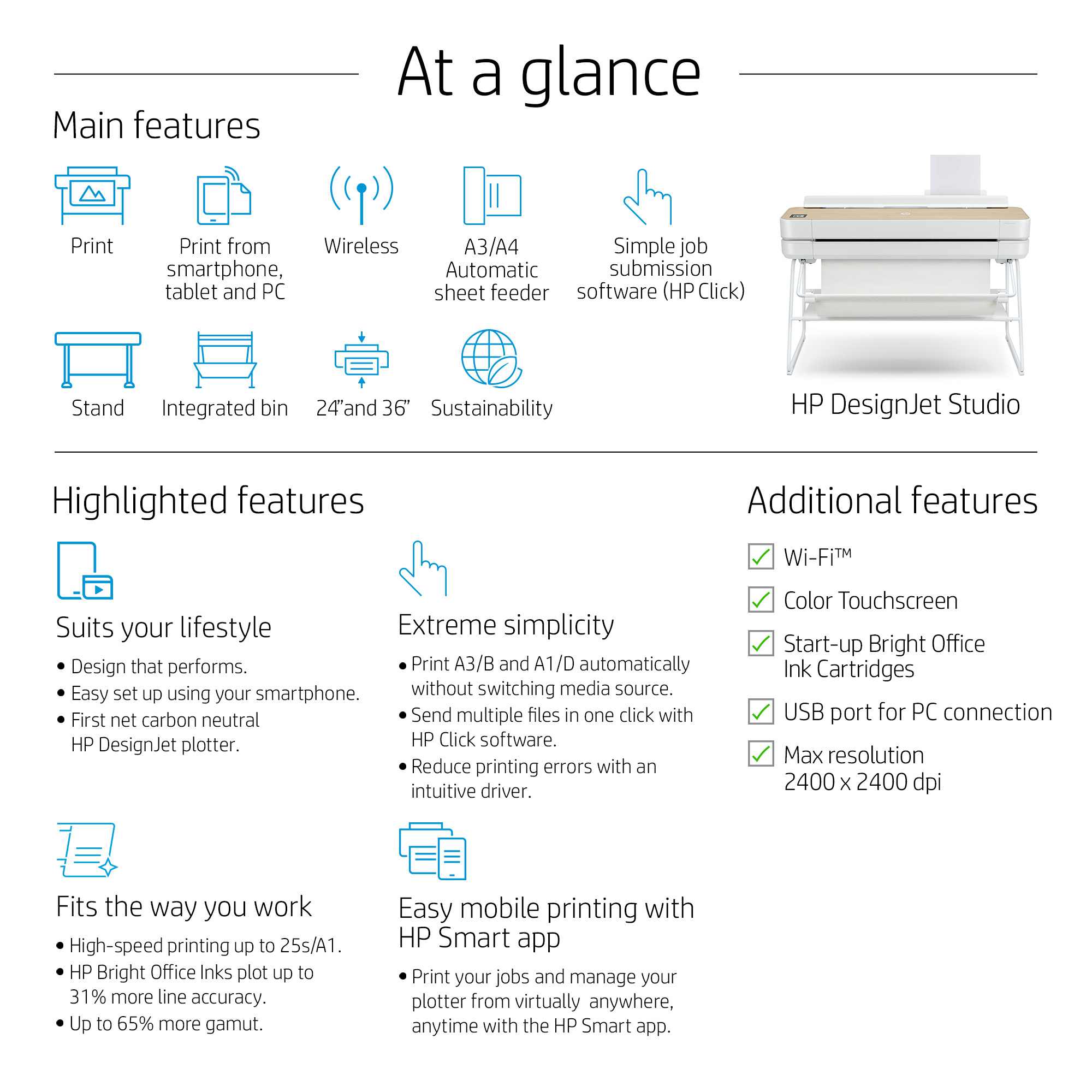 | Box contents | HP DesignJet Studio 24-in Printer, printer stand, automatic sheet feeder, roll cover, printhead, introductory ink cartridges, spindle, quick reference guide, setup poster, power cord |
