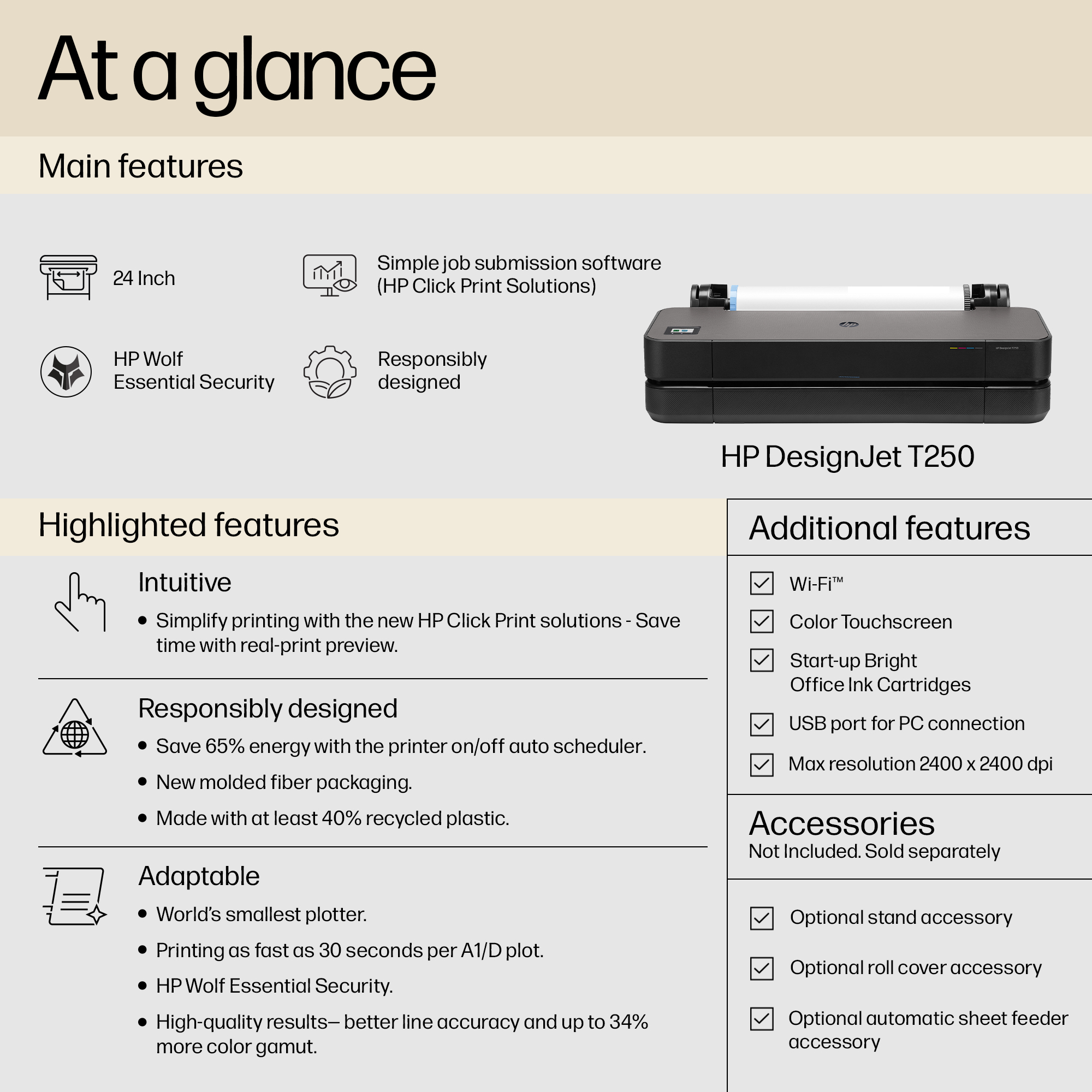 | Box contents | HP DesignJet T250 24-in Printer, printhead, introductory ink cartridges, spindle, quick reference guide, setup poster, power cord |