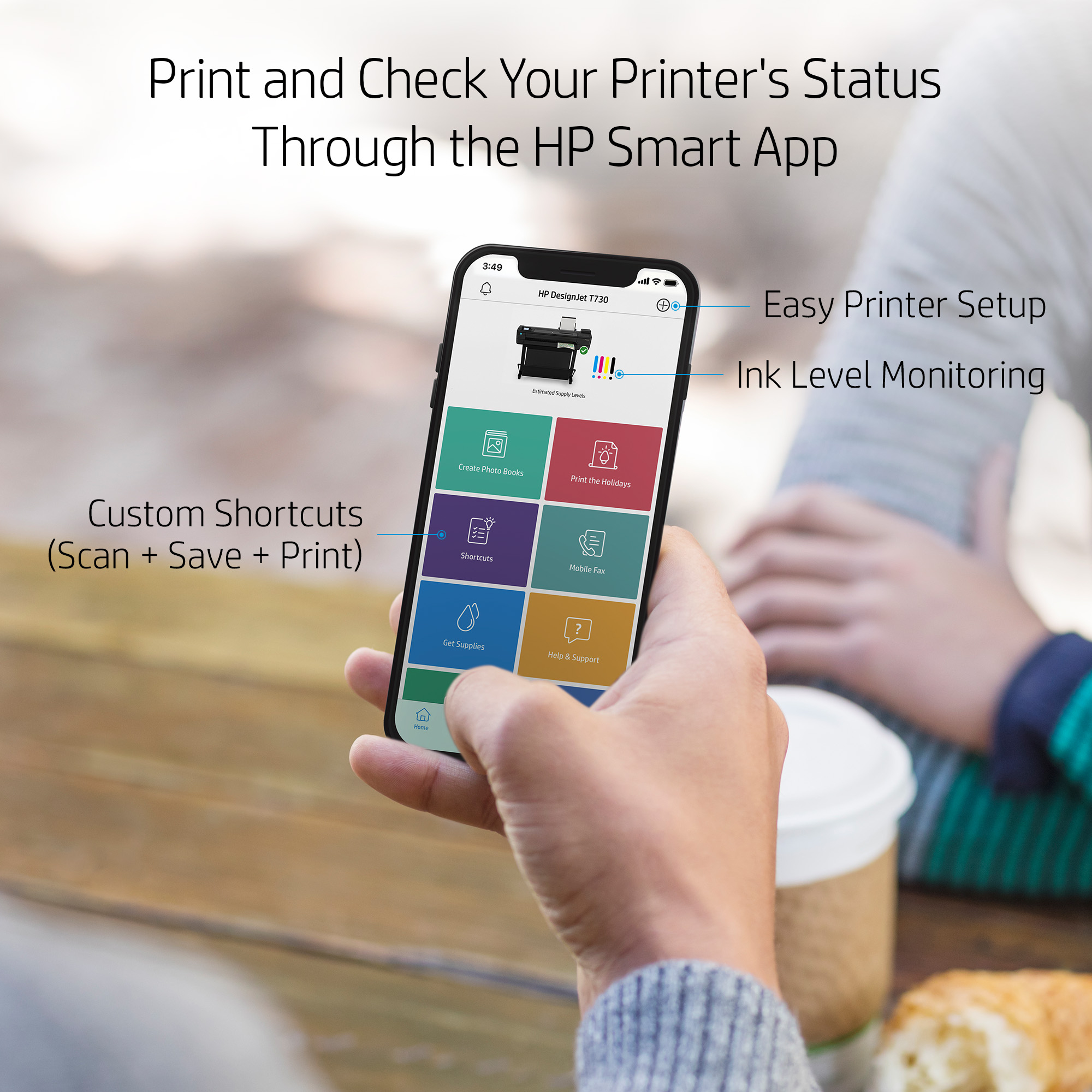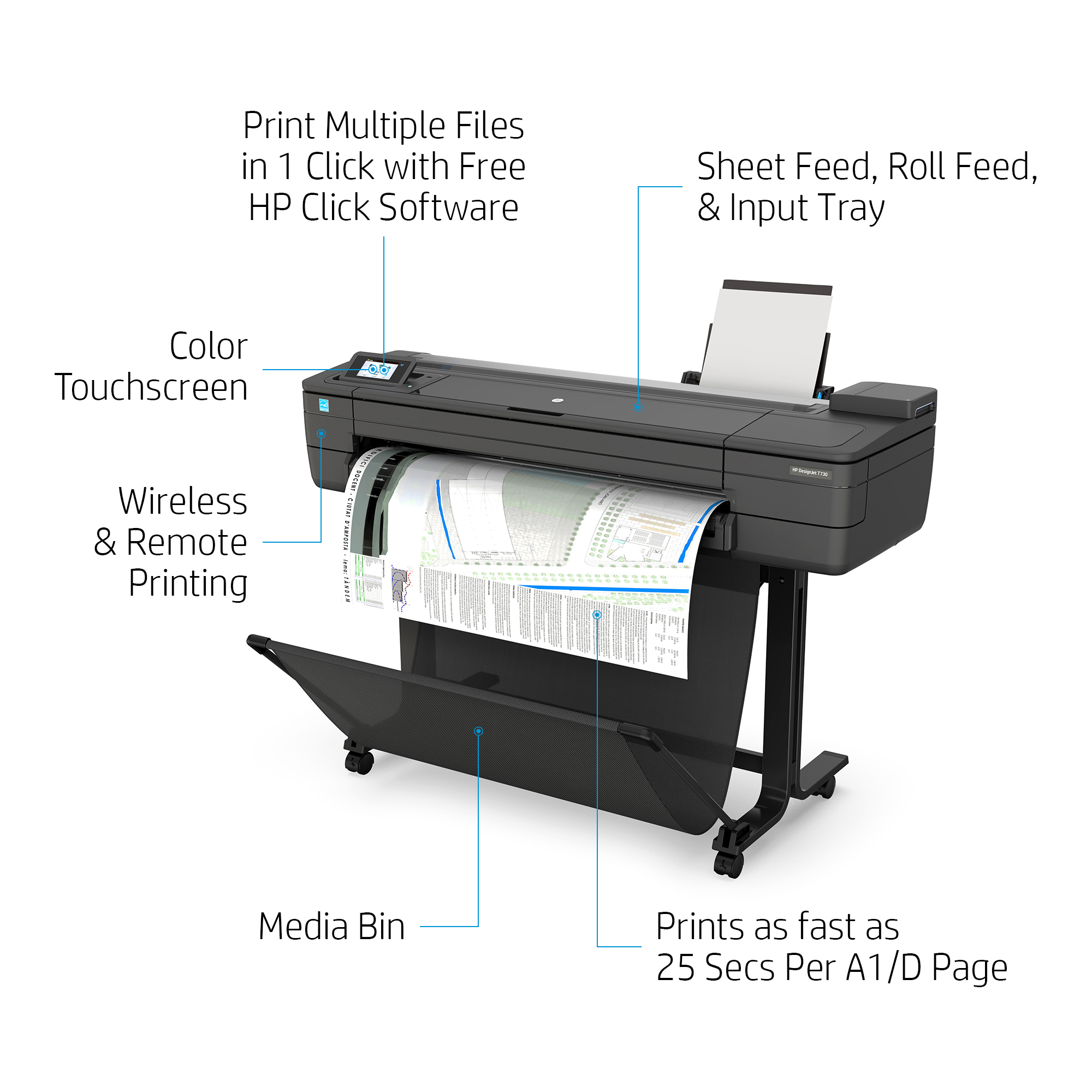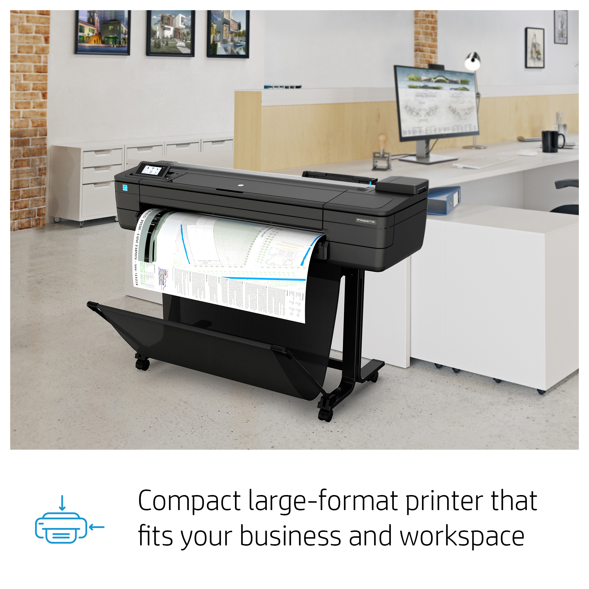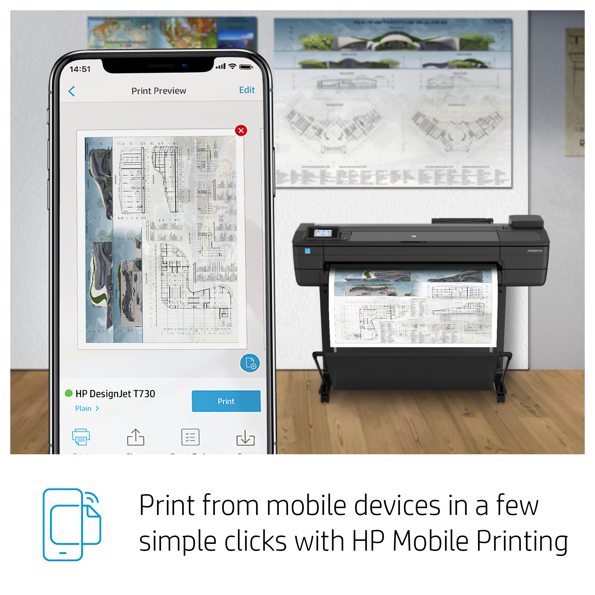 | Box contents | HP DesignJet T730 Printer, printhead, ink cartridges, printer stand, spindle, quick reference guide, setup poster, startup software, power cord |