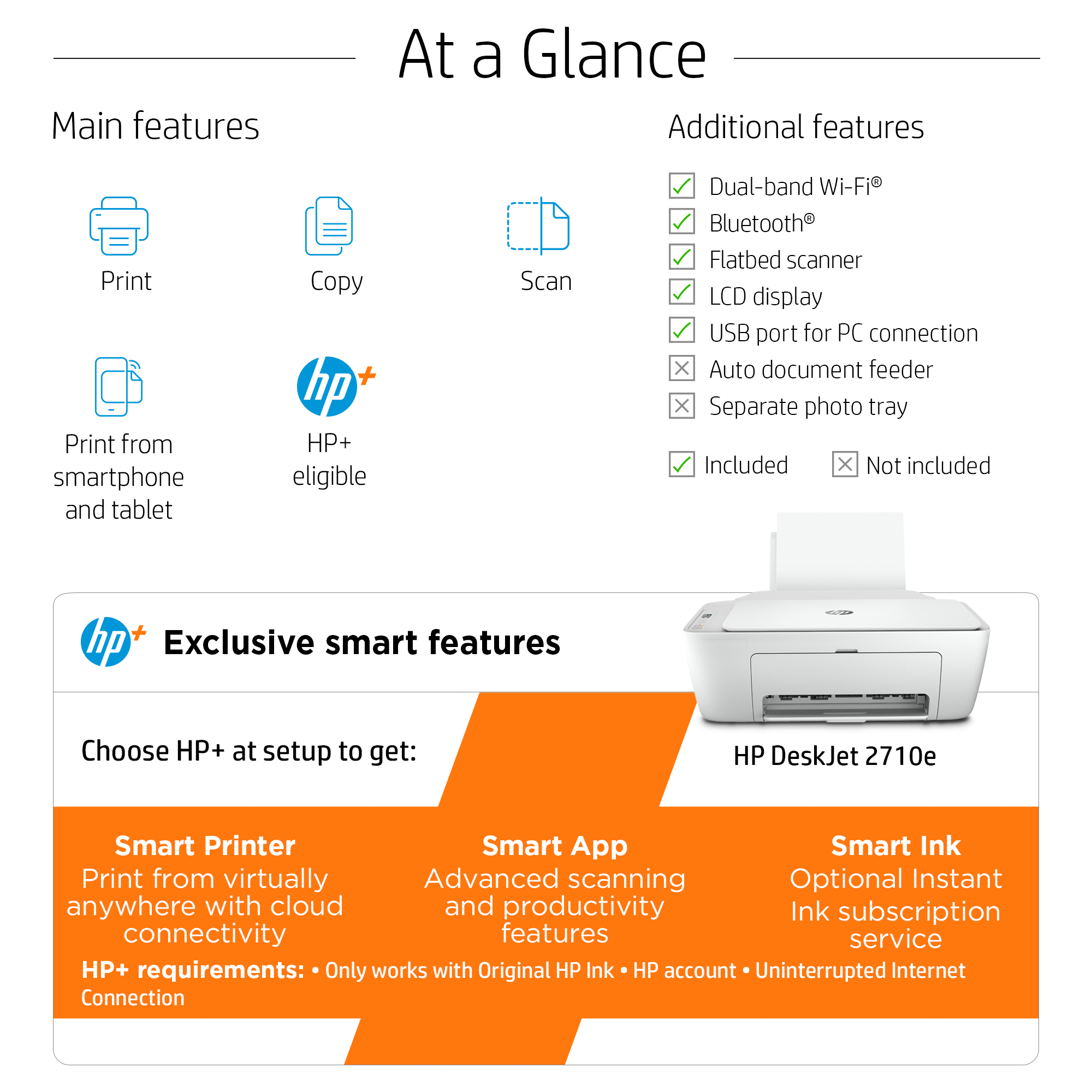 HP+ requires an HP account, ongoing internet connection, and use of Original HP ink cartridges.