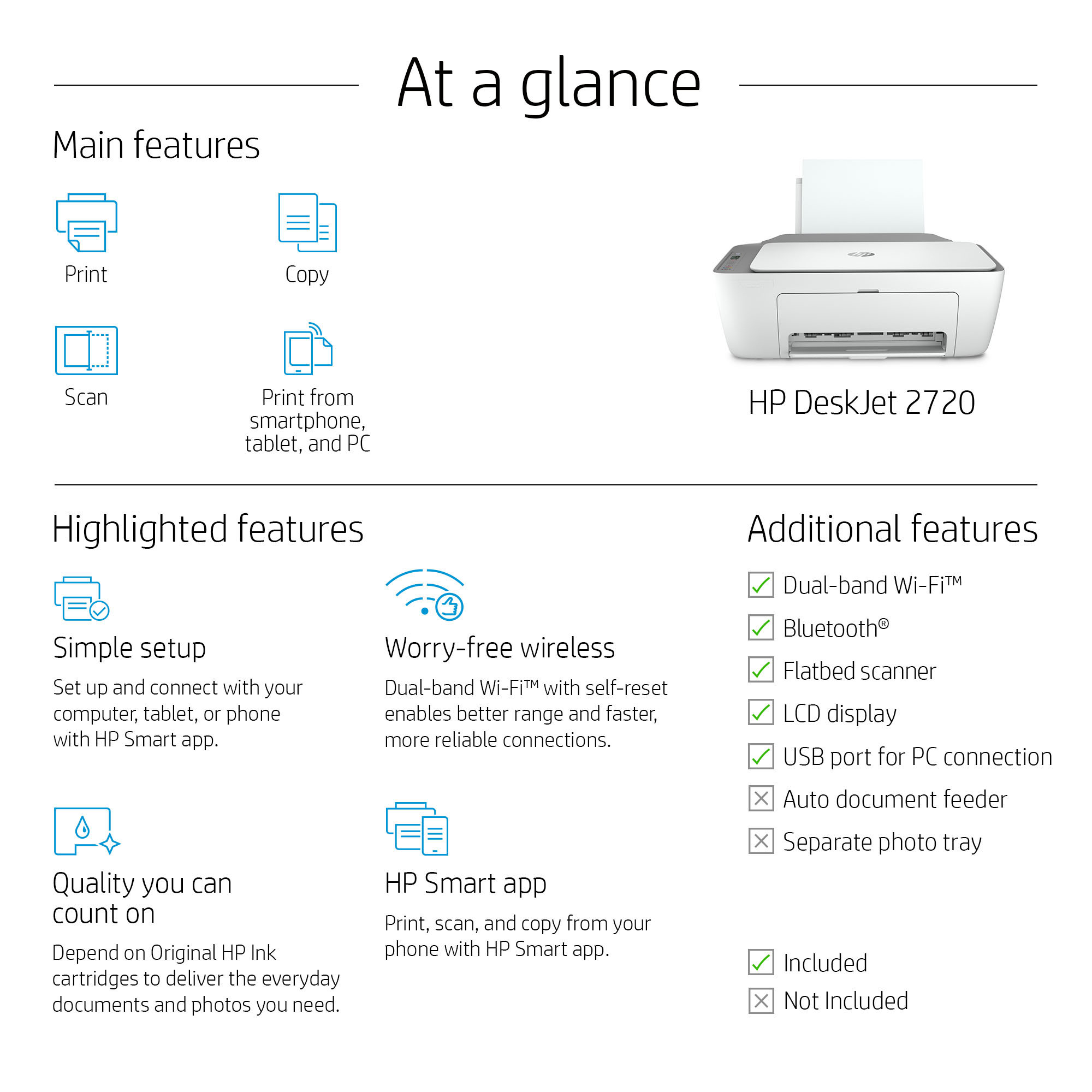 | Box contents | HP DeskJet 2720 All-in-One printer; HP 305 Setup Black Cartridge; HP 305 Setup Tri-color Cartridge; Regulatory flyer; Setup guide; Reference guide; Power cord. For ink volume and page yield information, visit http://www.hp.com/go/learnaboutsupplies |