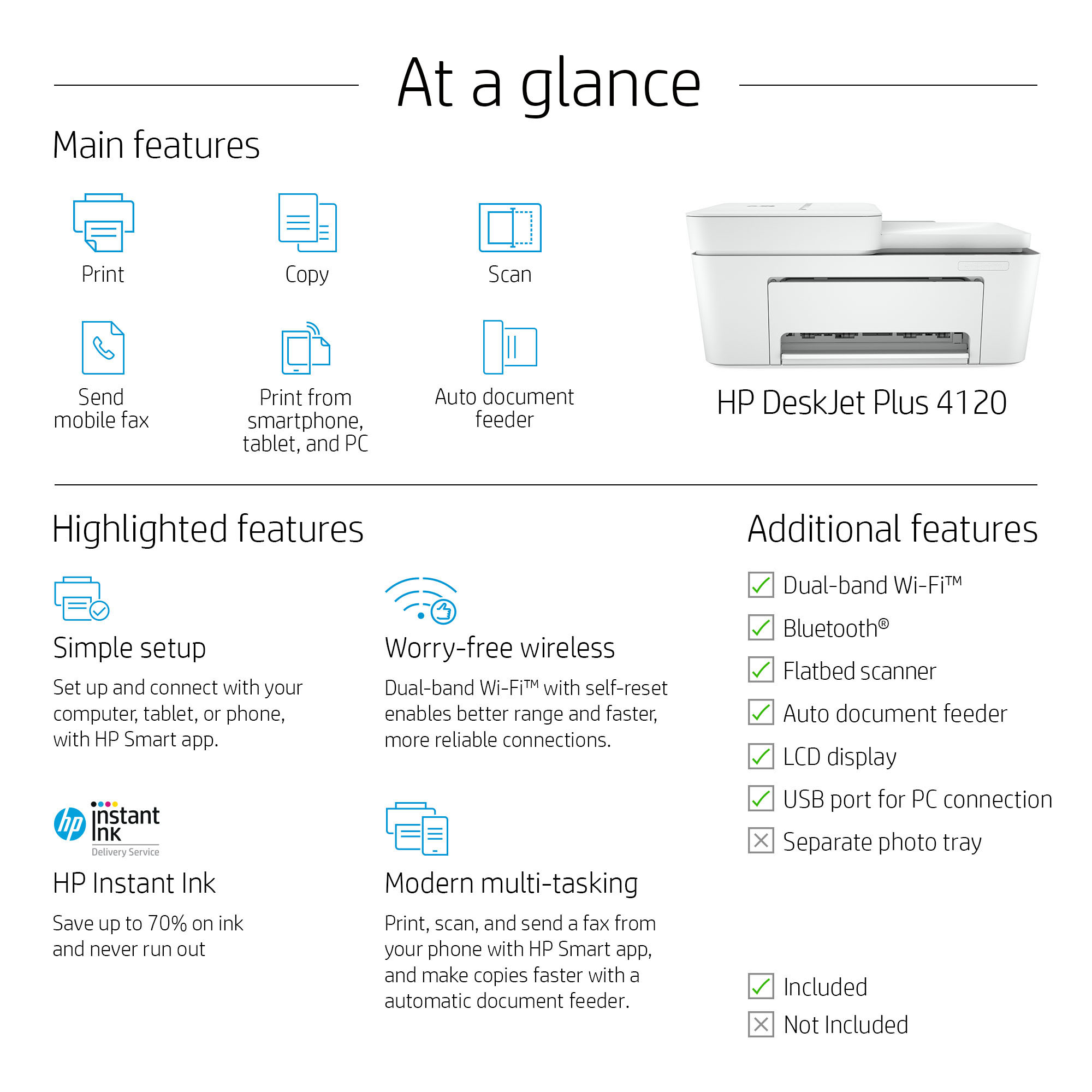 | Box contents | HP DeskJet 4120 All-in-One printer; HP 305 Setup Black Cartridge; HP 305 Setup Tri-color Cartridge; Regulatory flyer; Setup guide; Reference guide; Power cord. For ink volume and page yield information, visit http://www.hp.com/go/learnaboutsupplies. |