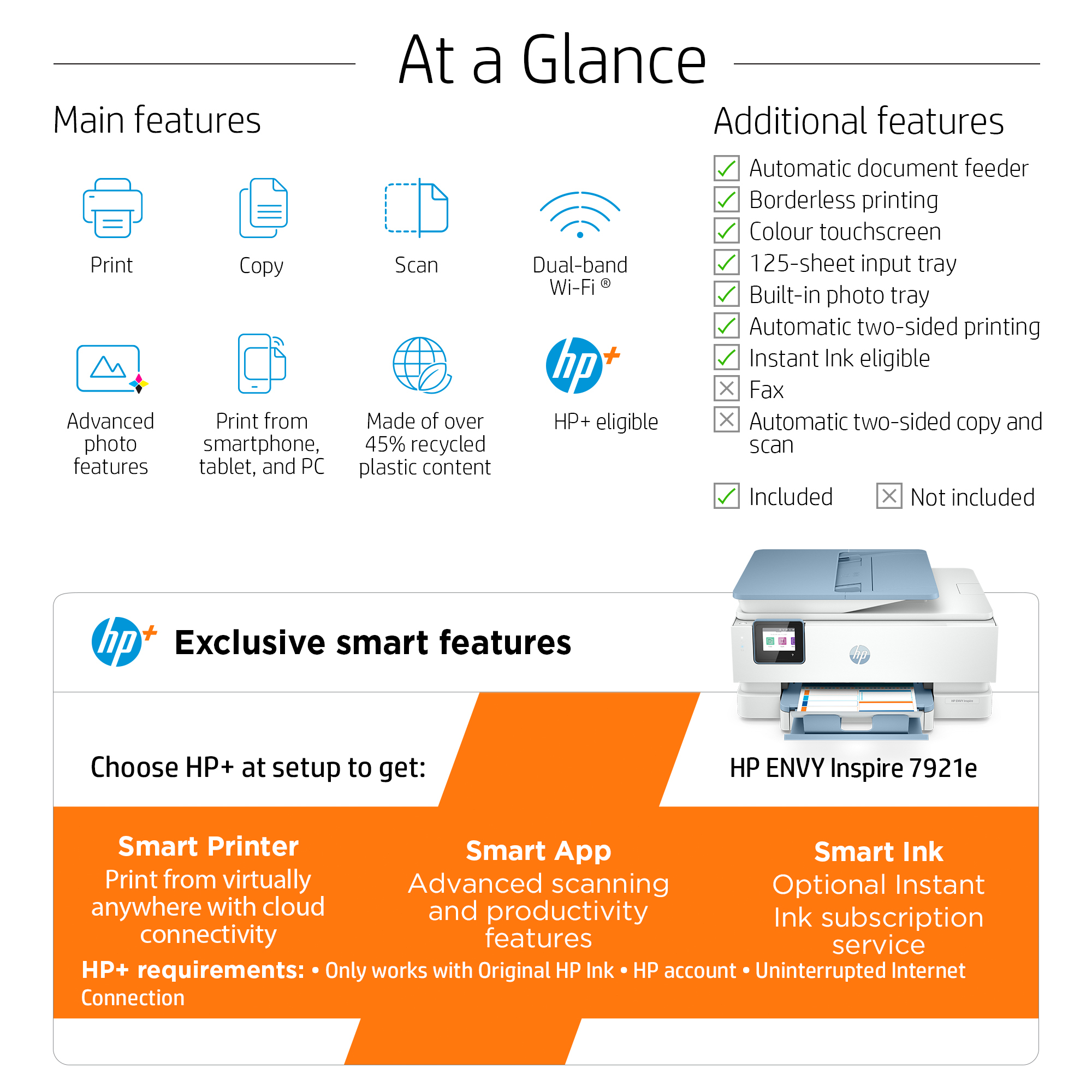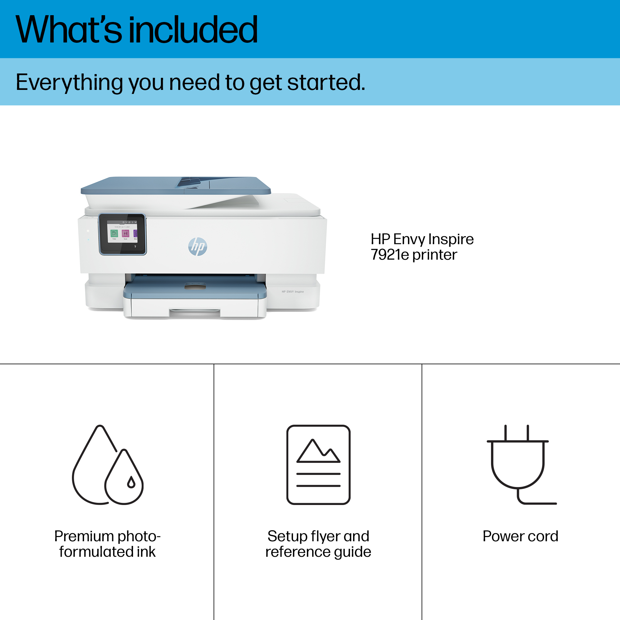| Box contents | HP ENVY Inspire 7921e All-in-One Printer; HP 303 Setup Black Instant Ink Ready Cartridge; HP 303 Setup Tri-Color Instant Ink Ready Cartridge; Ink Caution flyer; Regulatory flyer; Setup guide; Reference guide; Power cord HP Advanced Glossy and Matte Photo Inbox pouch; [For ink volume and page yield information, visit http://hp.com/go/learnaboutsupplies] |