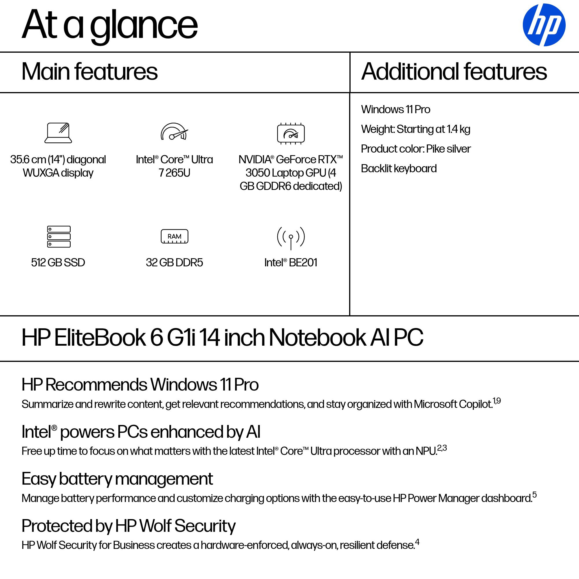 AI-based experiences and modern connectivity enhance user productivity. The HP EliteBook 6 G1i AI 14 inch PC offers an 11 TOPS NPU[3], enterprise-grade security and manageability in a highly configurable PC that meets the demanding needs of enterprise users.