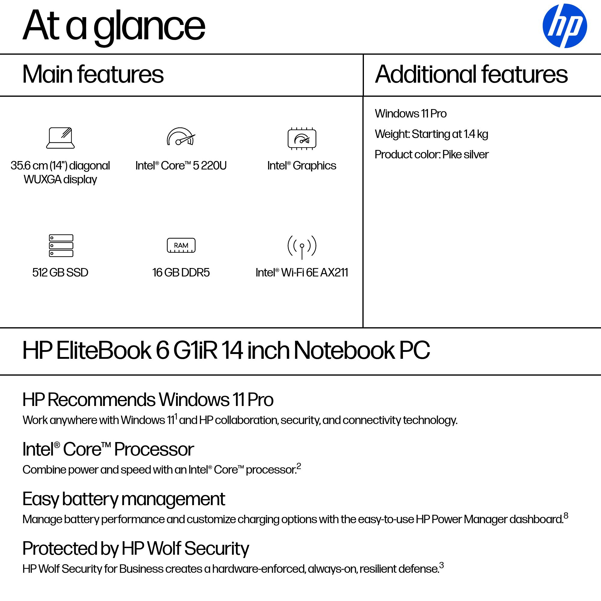 HP EliteBook 6 G1iR Intel Core 5 220U Laptop 35.6 cm (14") WUXGA 16 GB DDR5-SDRAM 512 GB SSD Wi-Fi 6E (802.11ax) Windows 11 Pro Silver