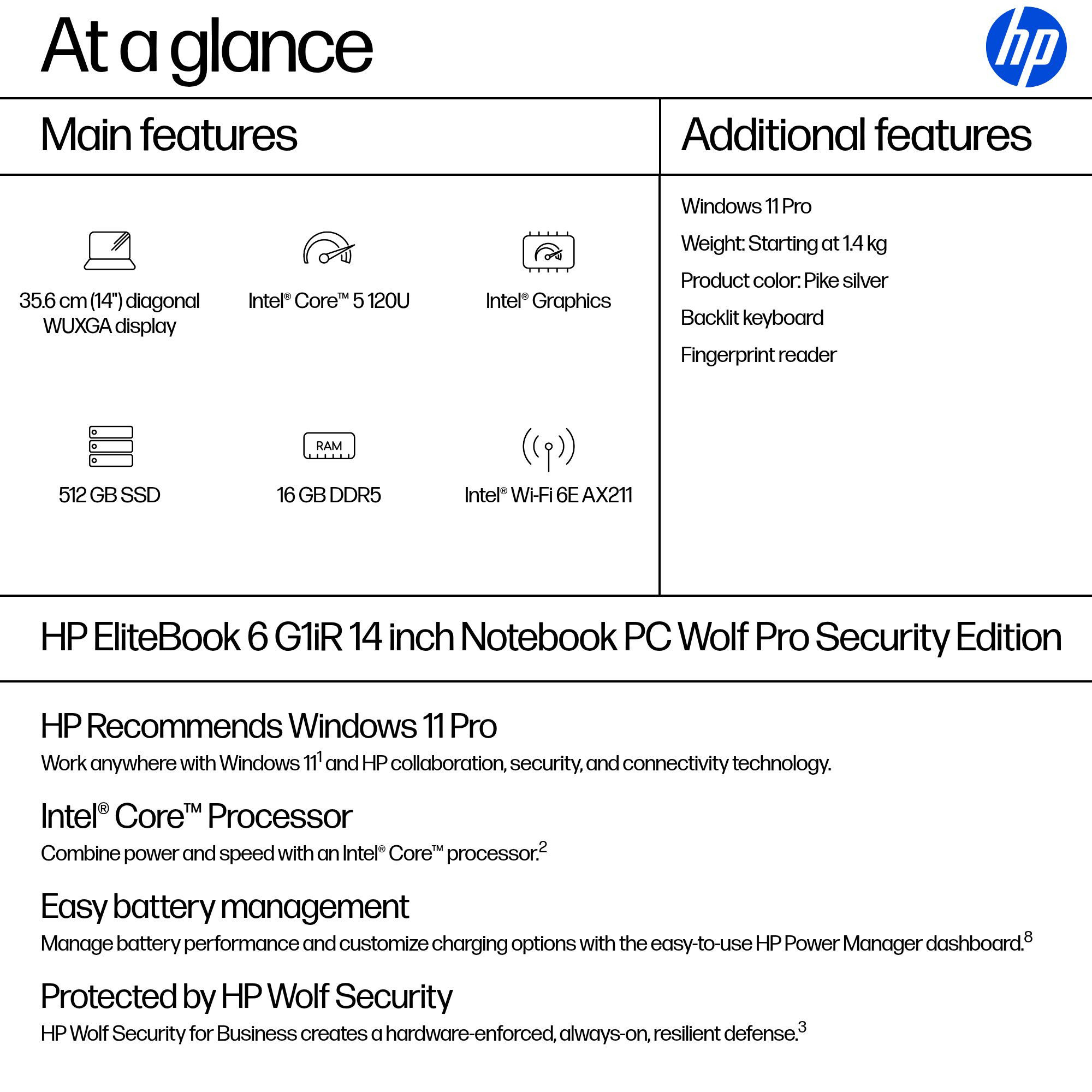 HP EliteBook 6 G1iR Wolf Pro Security Edition Intel Core 5 120U Laptop 35.6 cm (14") WUXGA 16 GB DDR5-SDRAM 512 GB SSD Wi-Fi 6E (802.11ax) Windows 11 Pro Silver