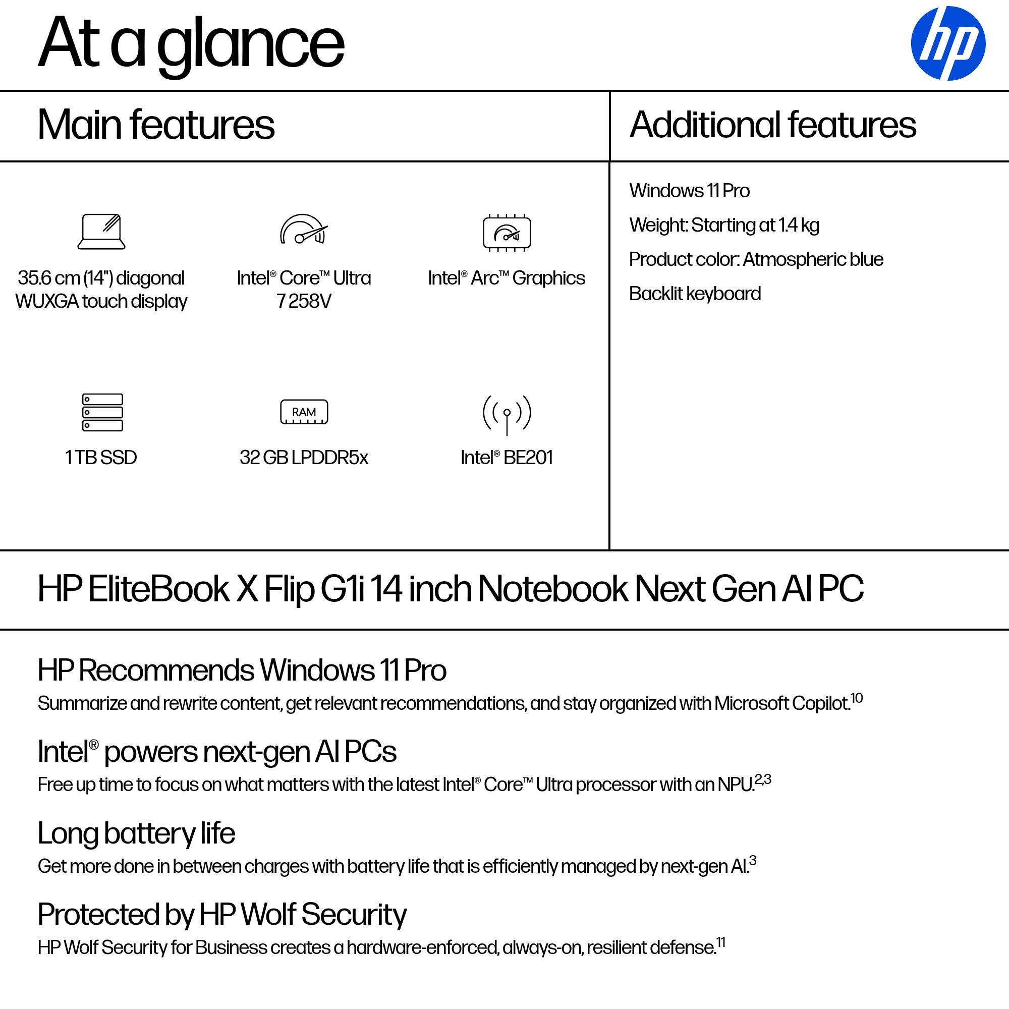 HP EliteBook X Flip G1i Next Gen AI PC Copilot+ PC Intel Core Ultra 7 258V Hybrid (2-in-1) 35.6 cm (14") Touchscreen WUXGA 32 GB LPDDR5x-SDRAM 1 TB SSD Wi-Fi 7 (802.11be) Windows 11 Pro Blue