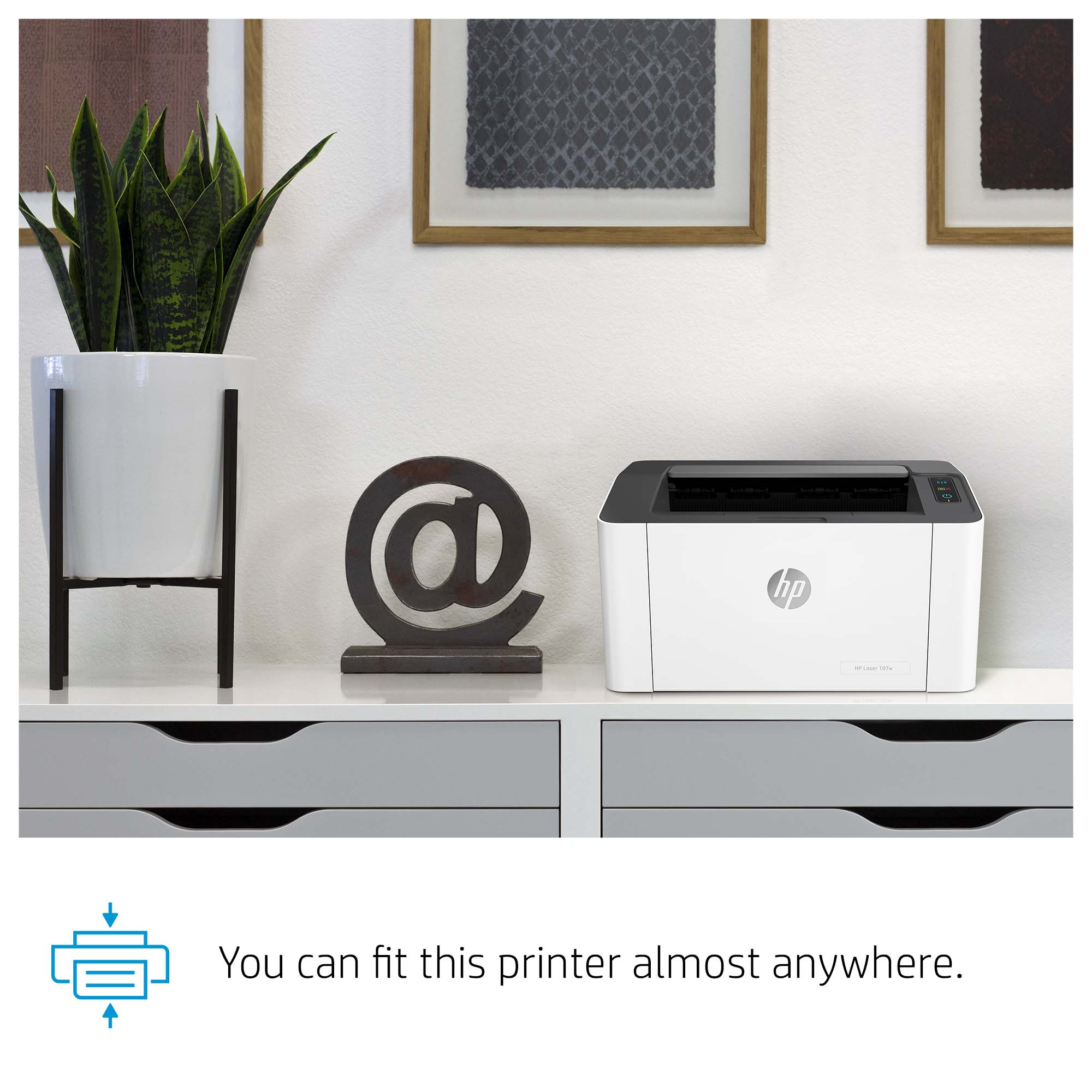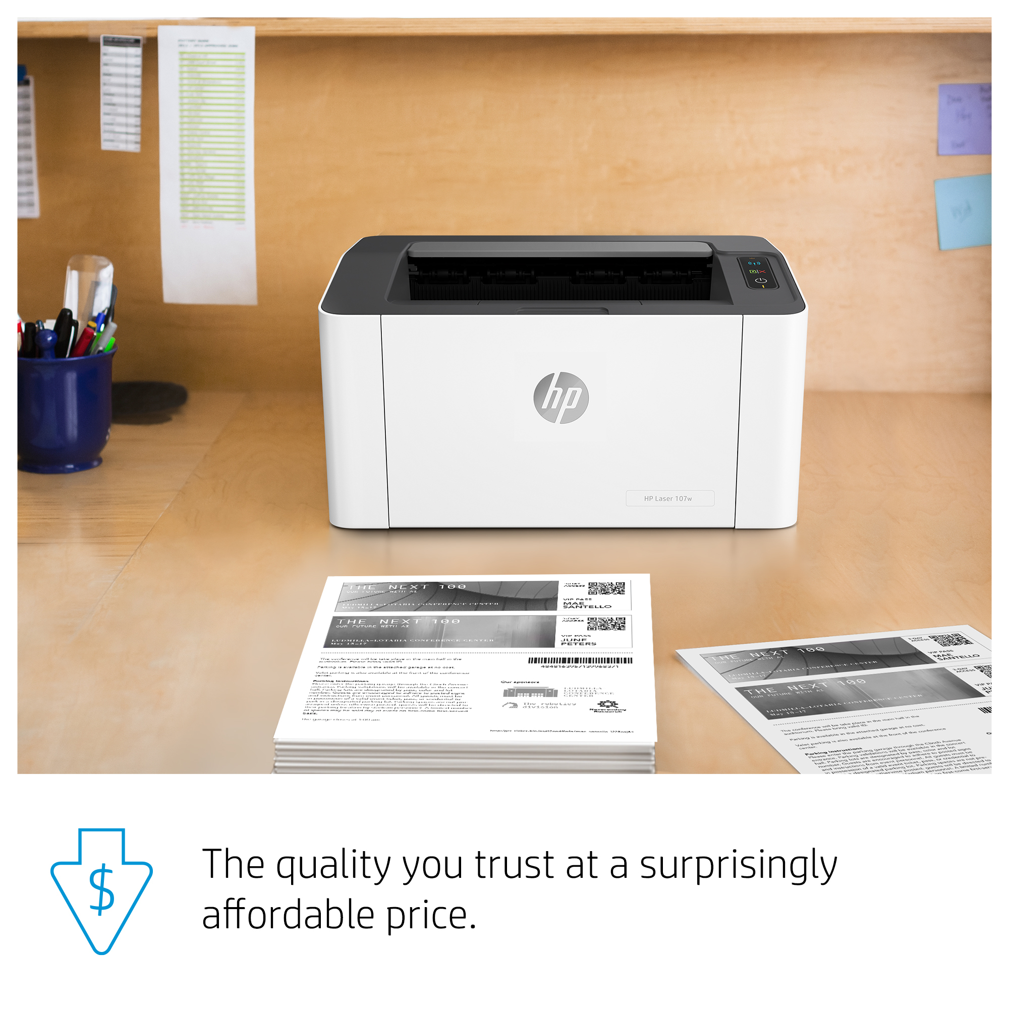 | Box contents | HP Laser 107w Printer; Preinstalled introductory HP Laser Black print cartridges (500 pages); Setup guide; Reference guide; Regulatory statements flyer; Power cord; USB cable |