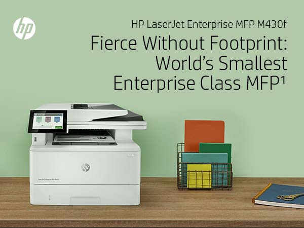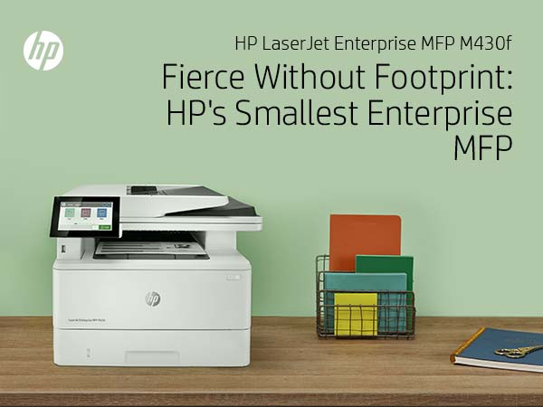| Box contents | HP LaserJet Enterprise MFP M430f printer; HP Black Original LaserJet Toner Cartridge (~3,000 pages); Getting started Guide; 1 Power cord |