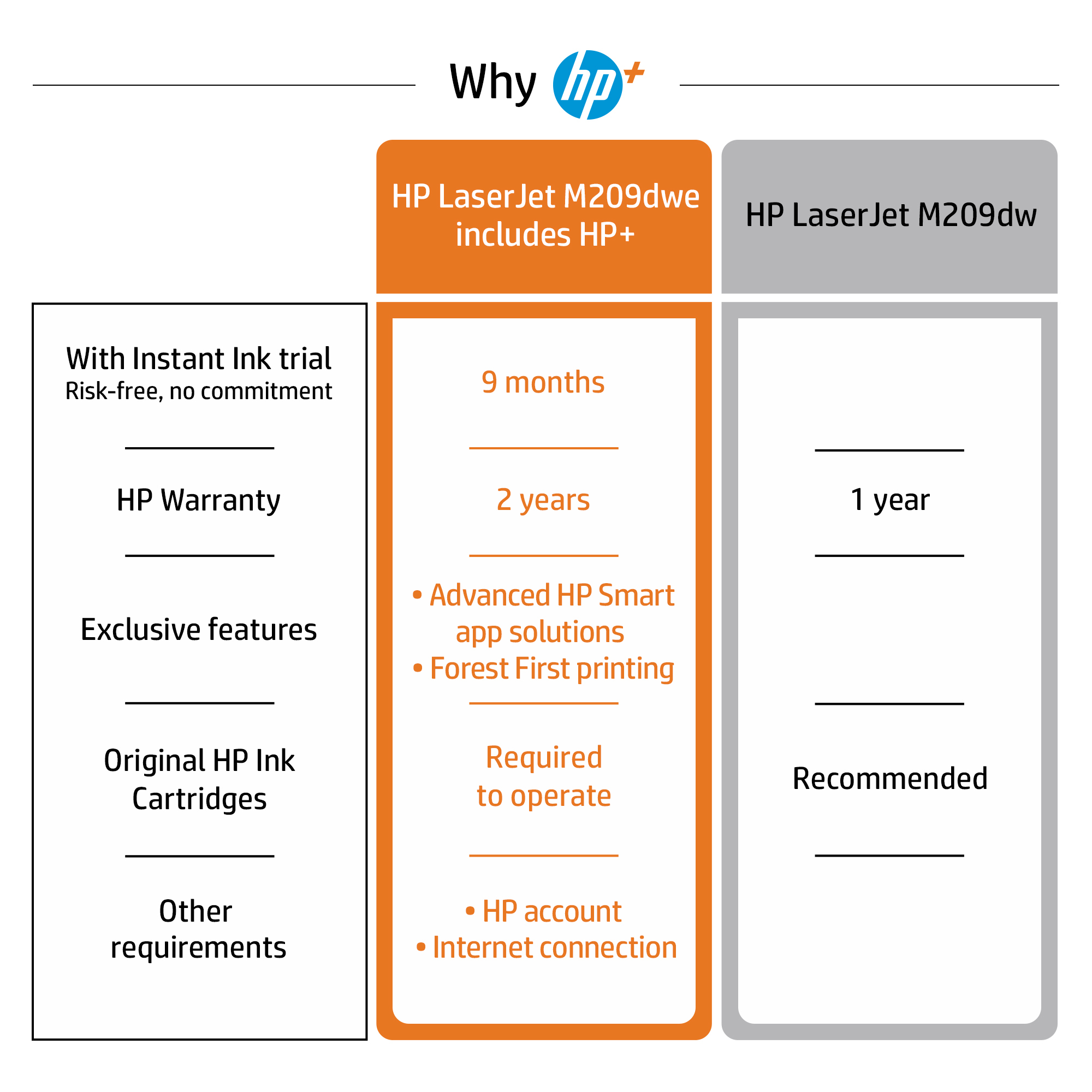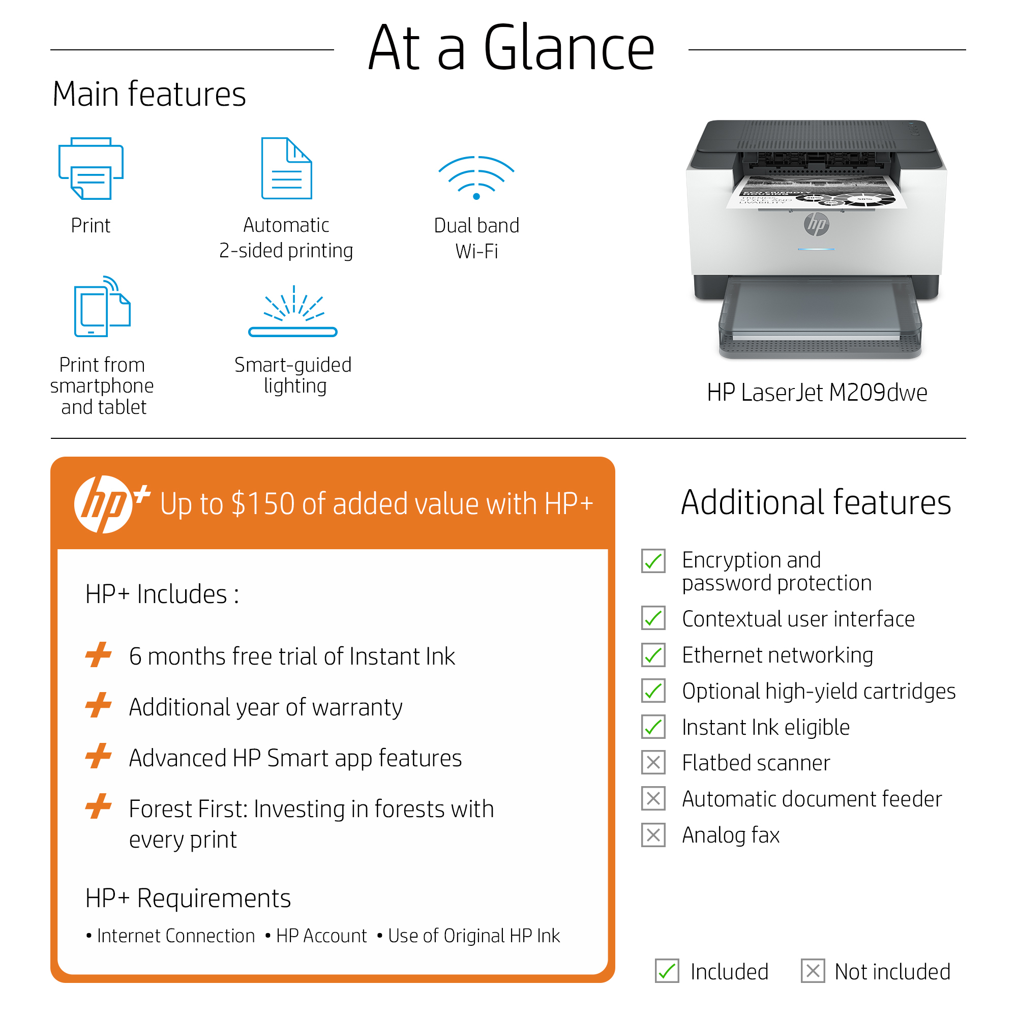 | Box contents | HP LaserJet Pro M209dwe Printer; HP Black LaserJet Toner Cartridge (~700 pages); Dust Cover; Reference Guide, Setup Poster, Warranty Guide & Flyer in some countries; Power cord |
