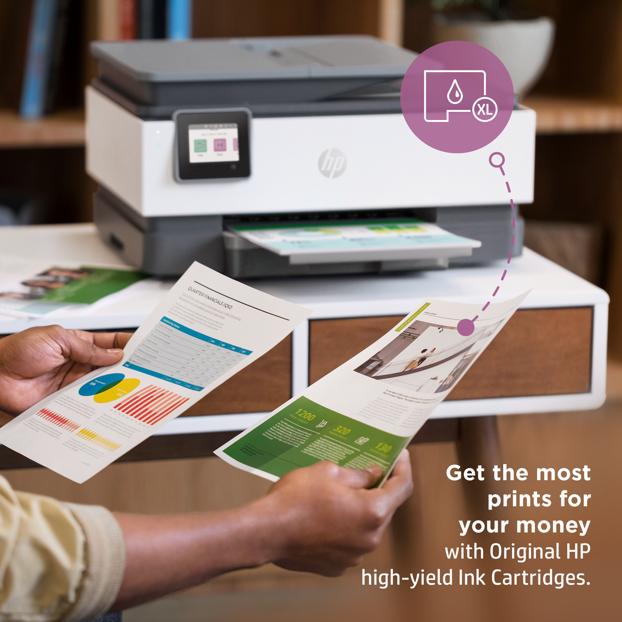 | Replacement cartridges | HP 912 Black Original Ink Cartridge (~300 pages) 3YL80AE; HP 912 Cyan Original Ink Cartridge 3YL77AE; HP 912 Magenta Original Ink Cartridge 3YL78AE; HP 912 Yellow Original Ink Cartridge 3YL79AE (CMY composite ~315 pages); HP 912XL Black Original Ink Cartridge (~825 pages) 3YL84AE; HP 912XL Cyan Original Ink Cartridge 3YL81A; HP 912XL Magenta Original Ink Cartridge 3YL82A; HP 912XL Yellow Original Ink Cartridge 3YL83A (CMY composite pages ~825); HP 917XL Black Original Ink Cartridge (~1,500 pages) 3YL85AE. Actual yield varies considerably based on content of printed pages and other factors. For details see http://www.hp.com/go/learnaboutsupplies |