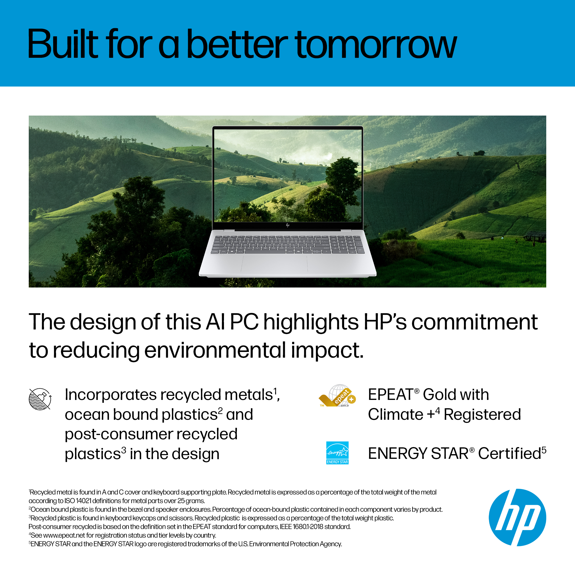 HP OmniBook 7 16 AI PCs are designed using recycled metals<sup>[3]</sup> and post-consumer recycled plastics<sup>[4]</sup>.