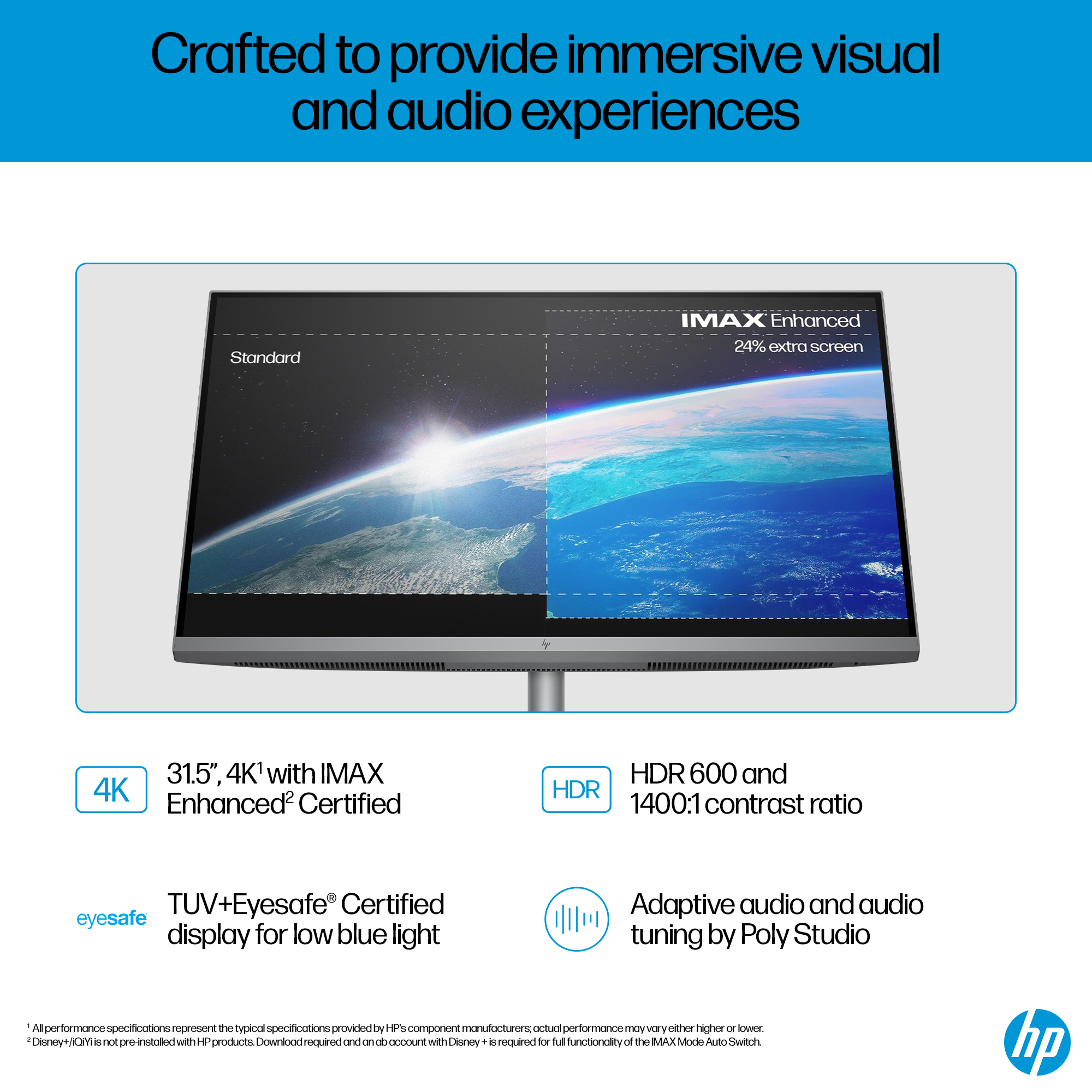 Conquer your most demanding tasks with the HP OmniStudio X 31.5-inch All-in-One Desktop PC and powerful Intel Core™ Ultra Processor[1]. Enjoy immersive visuals on a 4K[2] display with ultrafast connectivity and seamlessly transition between work and play with AI-powered comfort and wellness features.