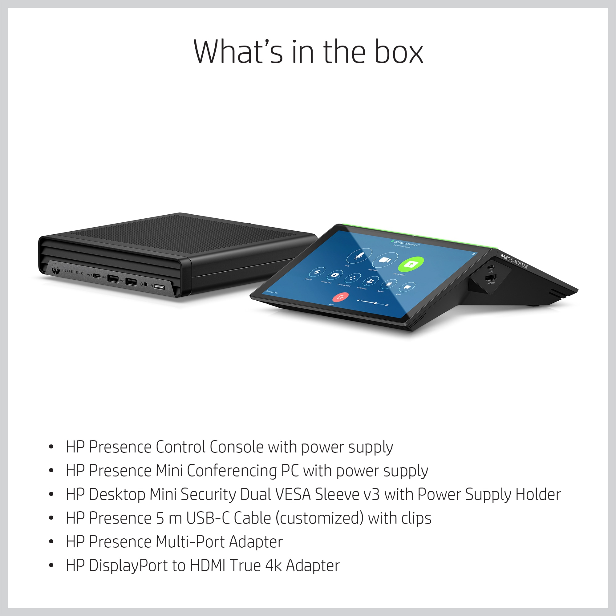 Remove barriers to conferencing and connect your workforce with the HP Presence Control with Audio, HP Presence Mini Conferencing PC, and HP Smart Set Up for huddle and small rooms.