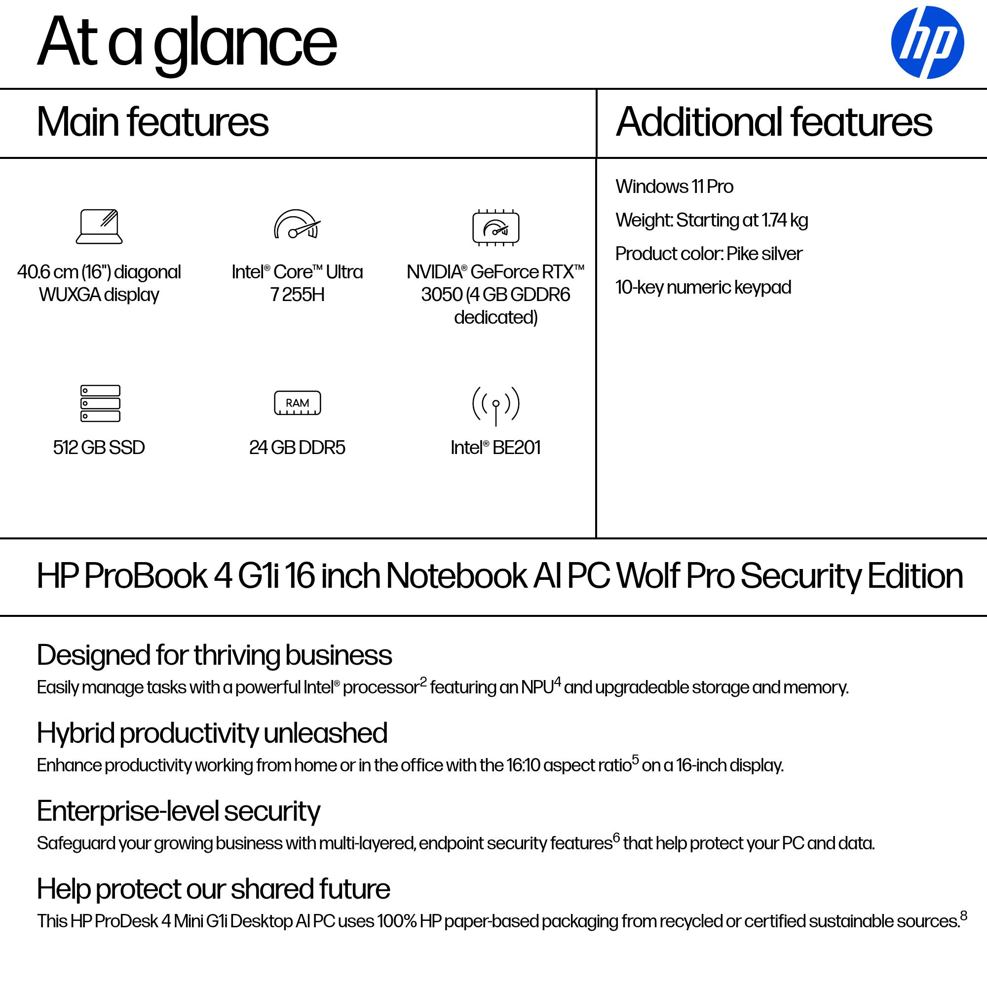 HP ProBook 4 G1i AI Wolf Pro Security Edition Intel Core Ultra 7 255H Laptop 40.6 cm (16") WUXGA 24 GB DDR5-SDRAM 512 GB SSD Wi-Fi 7 (802.11be) Windows 11 Pro AI PC Silver