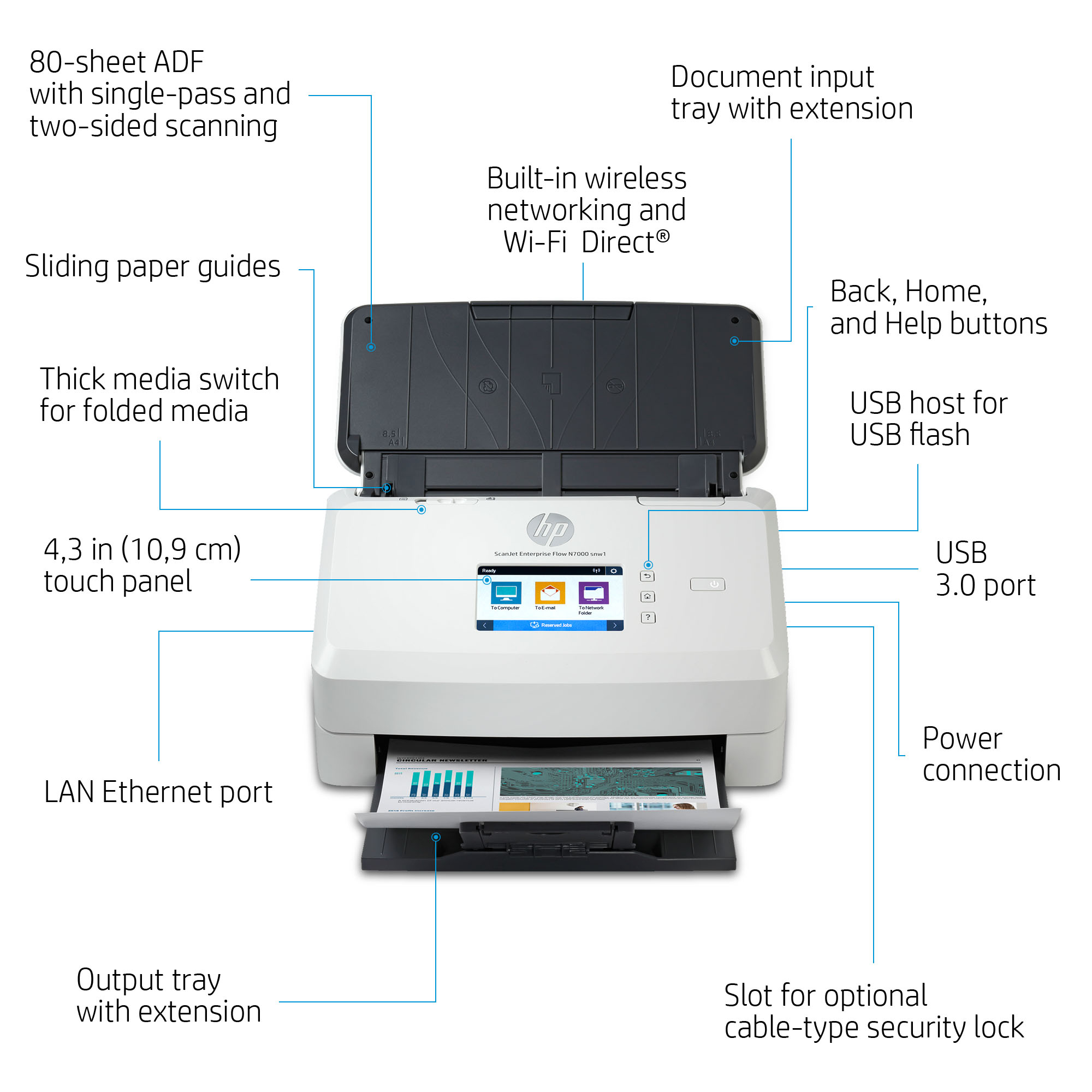 | Box contents | HP ScanJet Enterprise Flow N7000 snw1 scanner; Power cord; Power adapter; USB cable; Scanner engine; Flyers; Install guide |