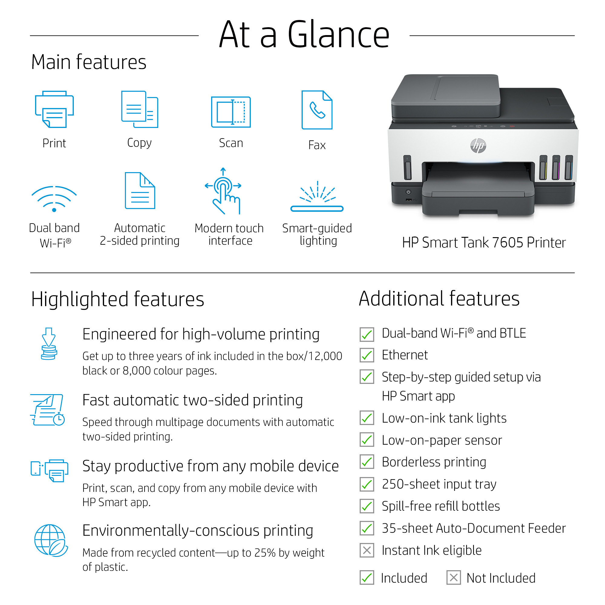 | Box contents | HP Smart Tank 7605 All-in-One; 2 x HP 32XL Black Original Ink Bottle; HP 31 Cyan Original Ink Bottle; HP 31 Magenta Original Ink Bottle; HP 31 Yellow Original Ink Bottle; HP Black Printhead; HP Tri-color Printhead; Ink caution flyer; Repacking flyer; Setup guide; Reference guide; Regulatory flyer; PT flyer; RoH-EAC Regulatory flyer; Power cord; Extended warranty flyer. For more information about fill and yield, see http://www.hp.com/go/learnaboutsupplies |
