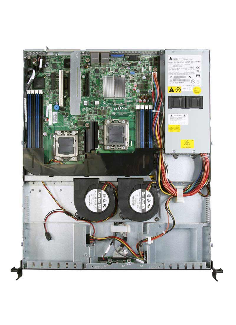 The 1U, Intel® Server System SR1630BC is ideal for space-constrained, high-density configurations featuring up to two Intel® Xeon® processors 5600 or 5500 series, eight DDR3 DIMM sockets, high-efficiency PSU, one low profile half-length PCI Express 2.0 x8 riser card, two fixed 3.5” SATA hard drives, and one optional slim-line optical drive.