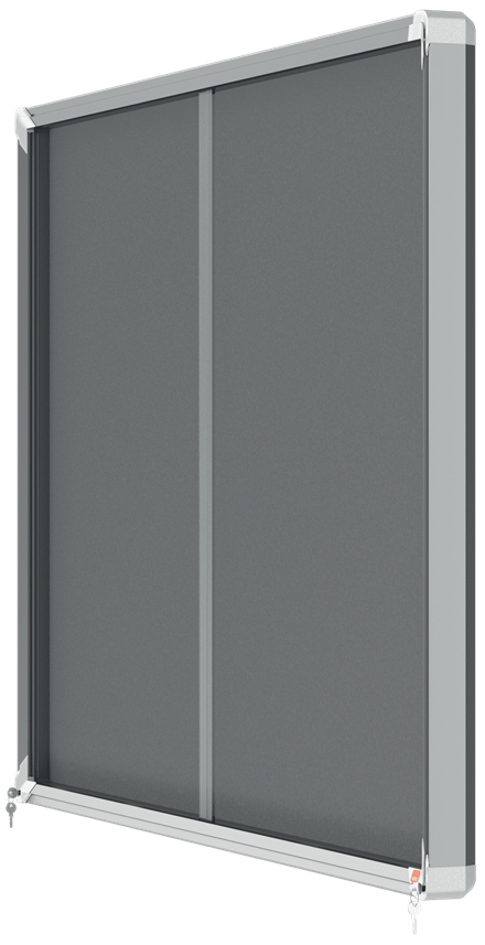 Felt lockable notice board with sliding glass doors and unobtrusive integrated corner lock. Complete with a modern stylish aluminum trim and fixed with a rail and through corner wall mounting. Excellent felt notice board surface to securely pin and display your notices. Size: 18xA4 sheets.