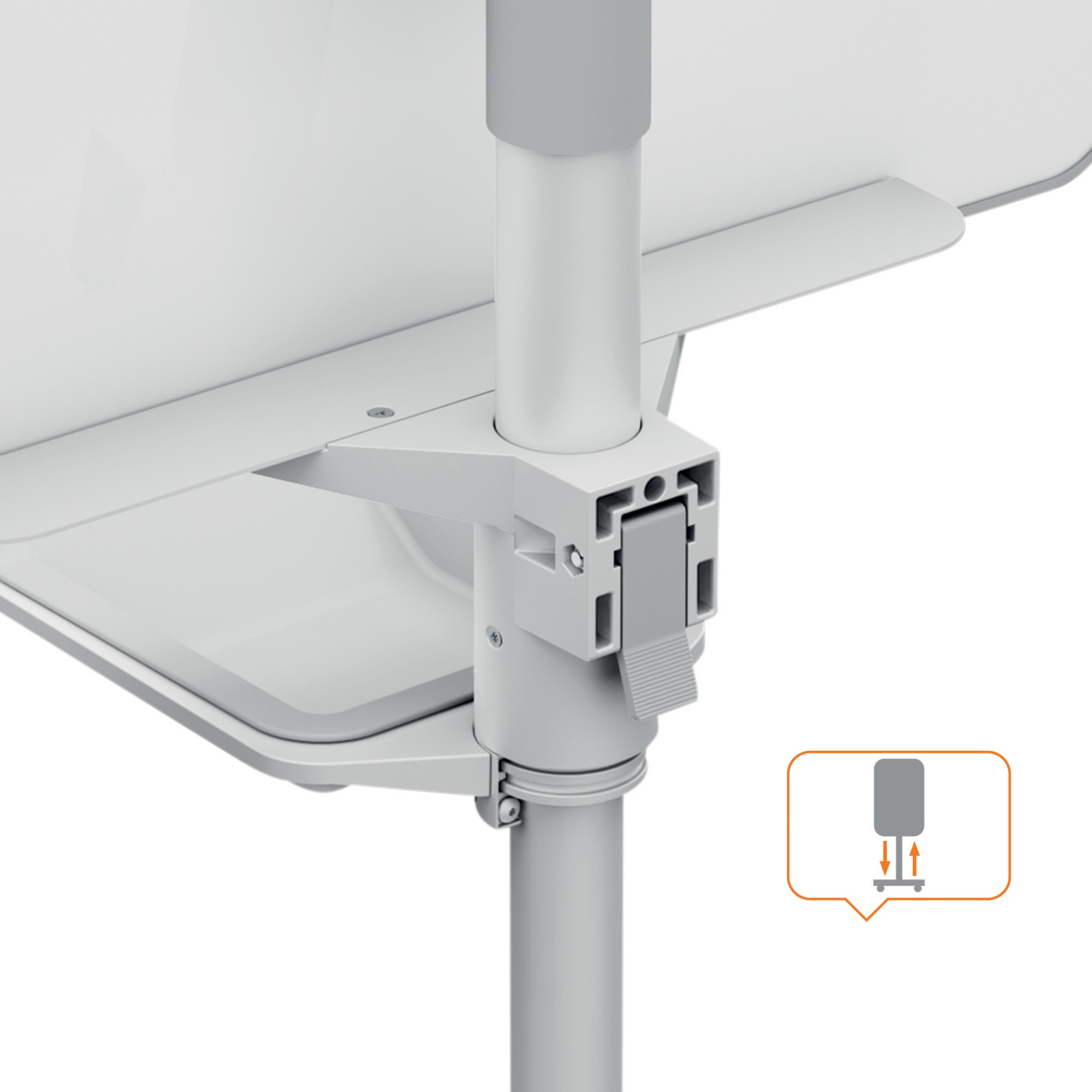 The Move & Meet Mobile Flipchart easel is ideal mobile collaboration tool, easily configured to meet your needs. The easel has a removable double sided magnetic whiteboard with a contemporary curved corner design that can be used on a desktop or mounted on the easel stand in a portrait or landscape format. Standing or sitting with simple height adjustment, lockable castors and extending arms creating an extended display area makes it the perfect tool for any collaborative office space, helping teams to create and share ideas. Includes whiteboard pen and integrated removable whiteboard accessory tray. Whiteboard size 680x1040mm.