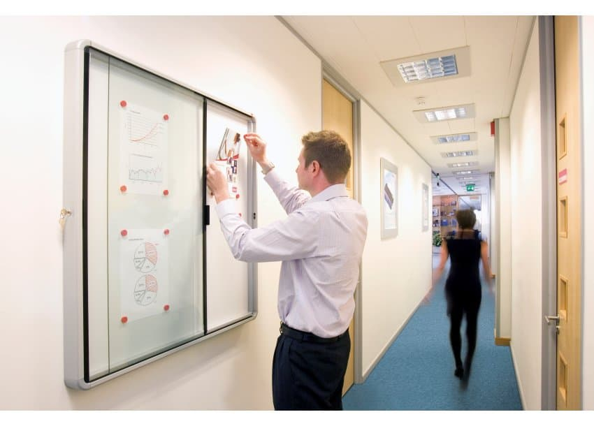 Magnetic lockable notice board with sliding glass doors and unobtrusive integrated corner lock. Complete with a modern stylish aluminum trim and fixed with a rail and through corner wall mounting. Excellent magnetic notice board surface to securely display your notices. Size: 12xA4 sheets.