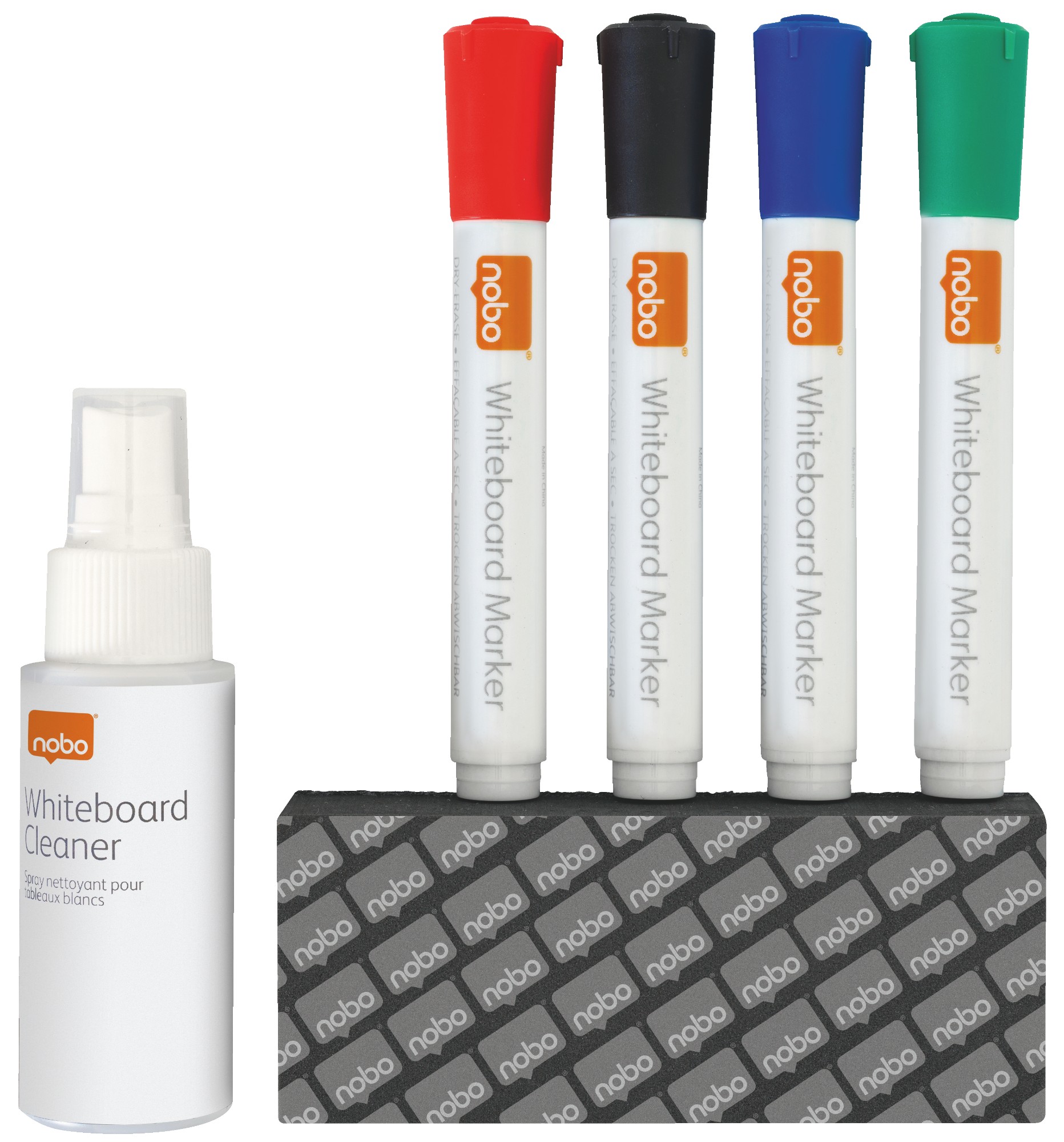 This whiteboard Starter kit has everything you need to get started with your Nobo dry erase whiteboard. Pack of 4 low odour whiteboard pens (black, red, green and blue) to meet all your presentation needs. Supplied with a whiteboard eraser and spray cleaner to keep your whiteboard looking its best.