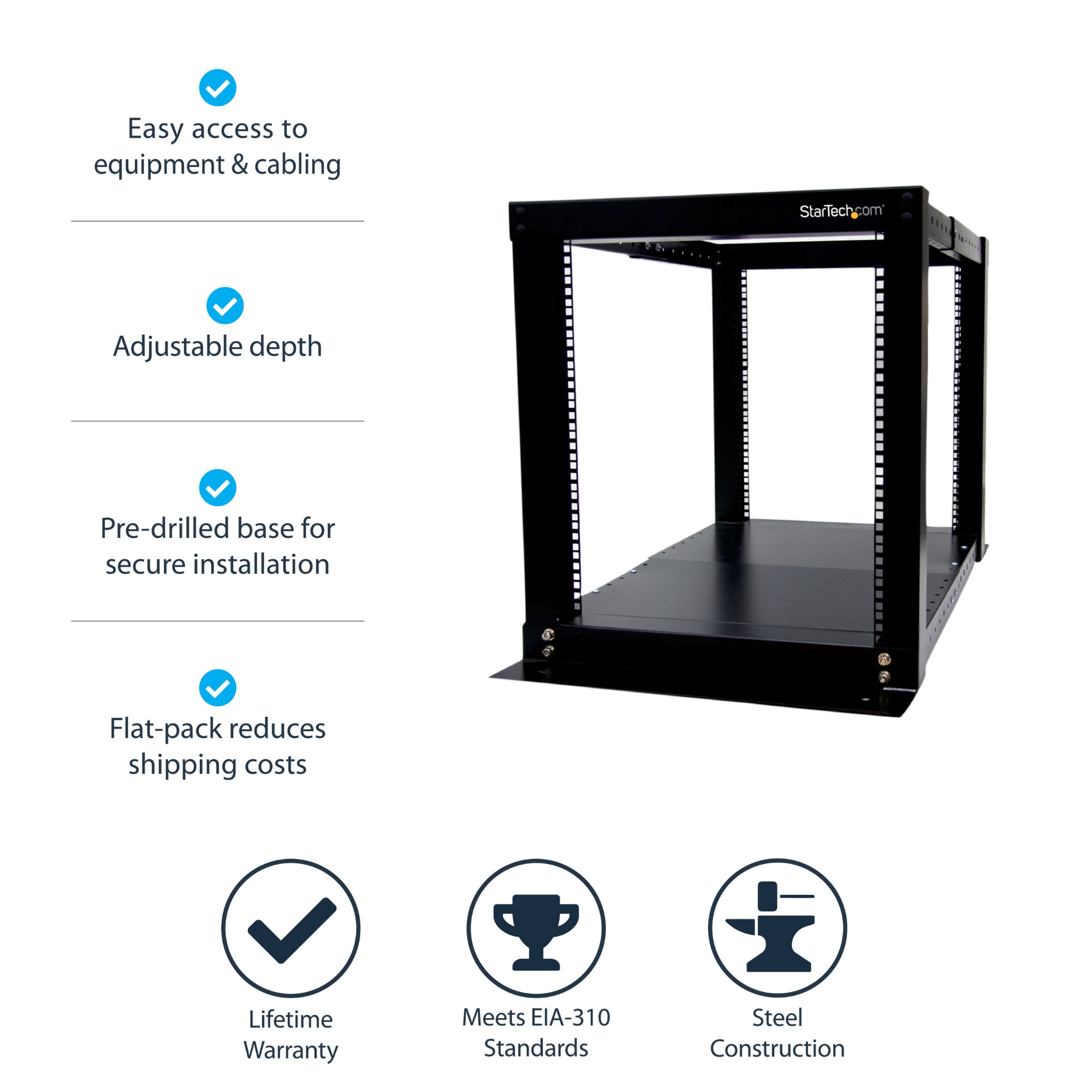 The equipment rack/cabinet features heavy gauge mounting rails to ensure a stable installation platform and adjustable posts for flexible installation. The 12U open frame rack is compliant with EIA-RS-310C standards, offering a universal design that's compatible with equipment from popular manufacturers. Plus, the equipment rack is flat-packed, reducing shipping costs and simplifying handling and assembly.