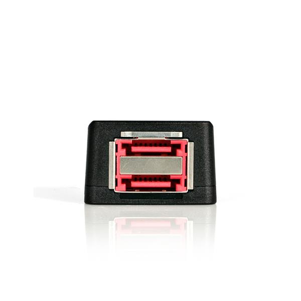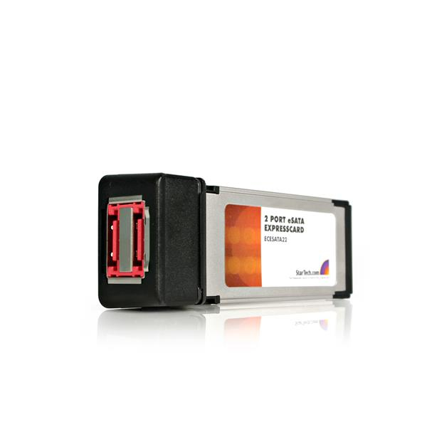 This 2 Port eSATA ExpressCard adapter lets laptop users experience the high performance capability of eSATA storage for data transfer rates of up to 3Gbps, as well as port multiplier capability with command-based switching for connecting multiple external hard drives to a host PC or Mac notebook through one eSATA connection.