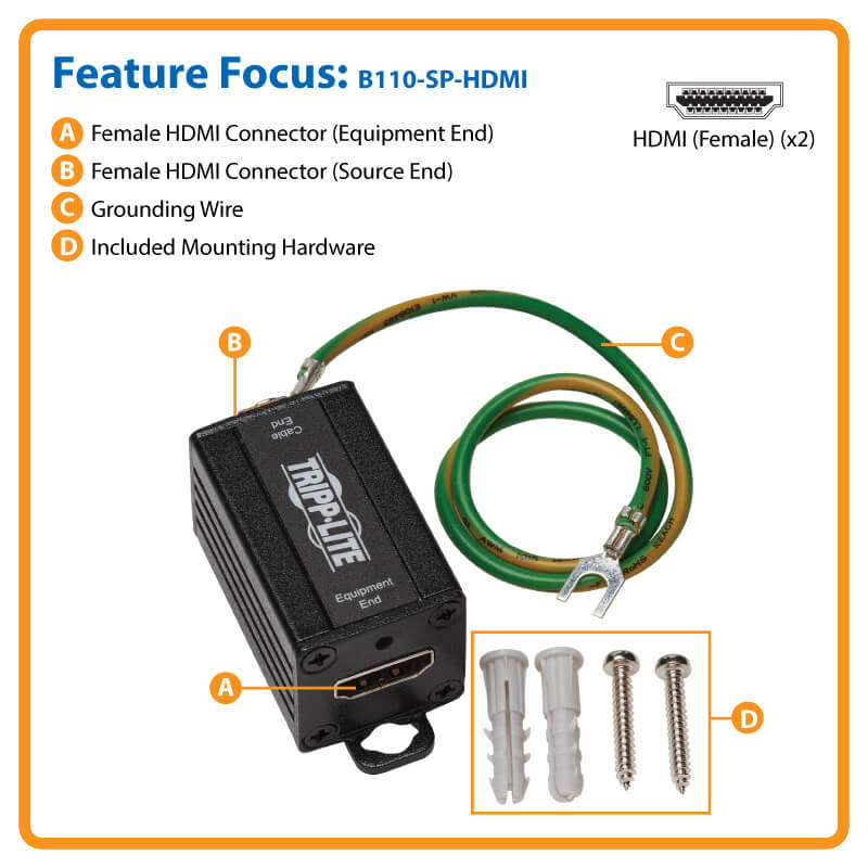 This HDMI in-line surge protector supports 4K x 2K resolutions up to 3840 x 2160 at 30 Hz. It is a passive design and requires no external power supply. The compact metal housing is designed to endure in applications where static discharge is likely to occur. Mounting hardware is included for convenient installation where needed. Be sure the distance between the B110-SP-HDMI and the equipment it is protecting is no more than three feet (0.9 meters).