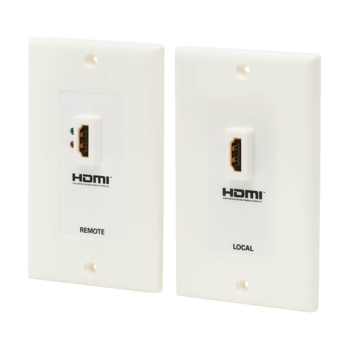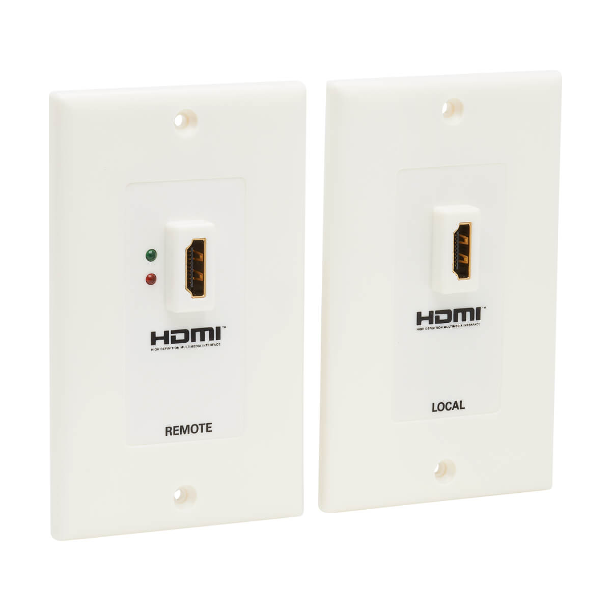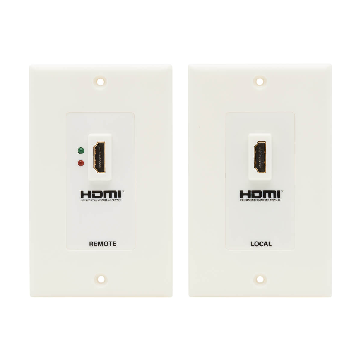 Simply run two Cat5/6 cables between the local transmitter and remote receiver wall plates, and plug in standard HDMI cables to the HDMI source and the display. The green LED on the remote receiver wall plate lets you know that power from the source and monitor. When functioning properly, only the green LED will be lit. If the red LED is illuminated, it means the remote receiver is not receiving a functional signal from the source.